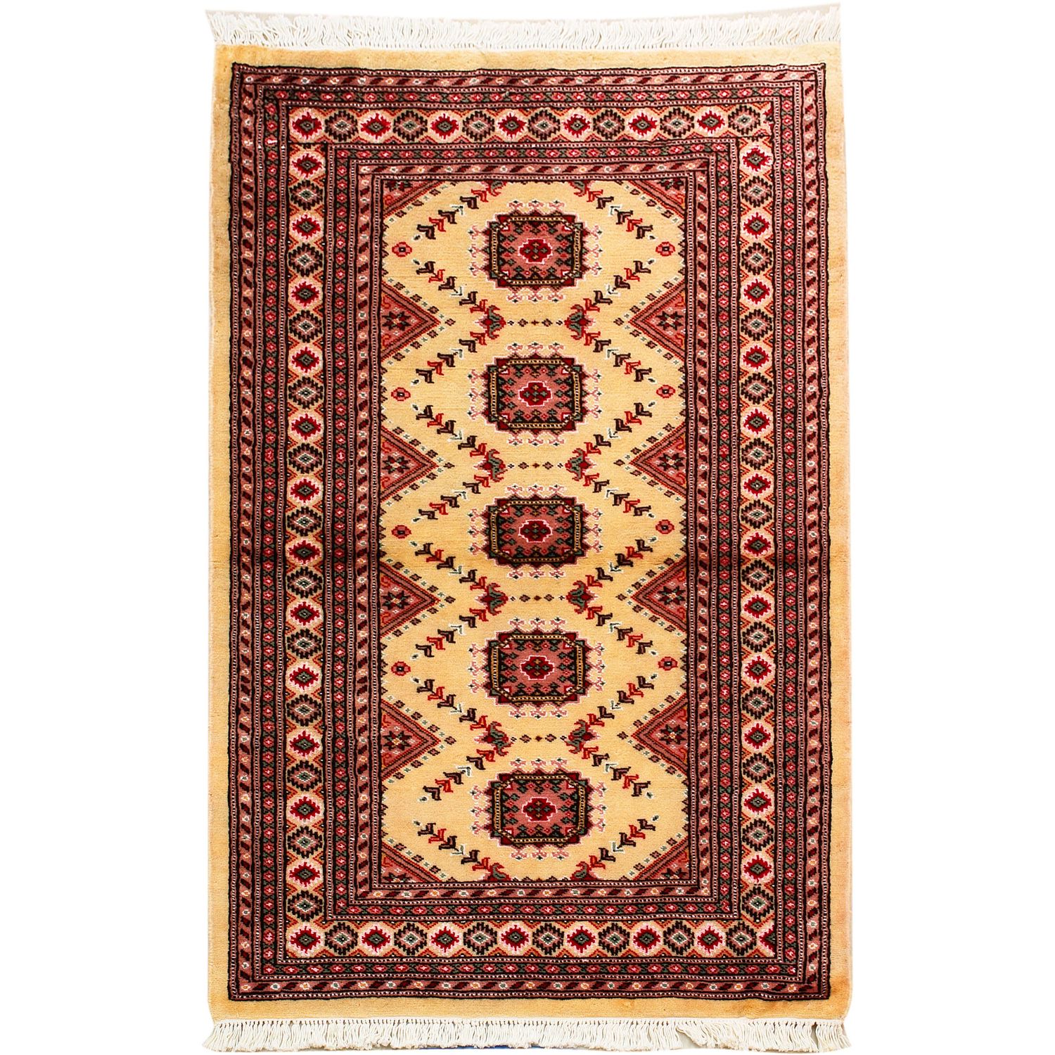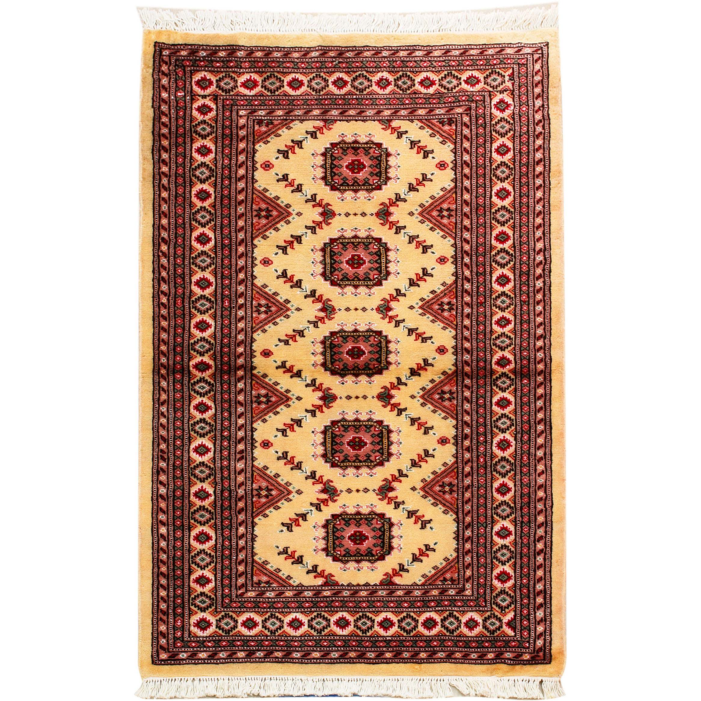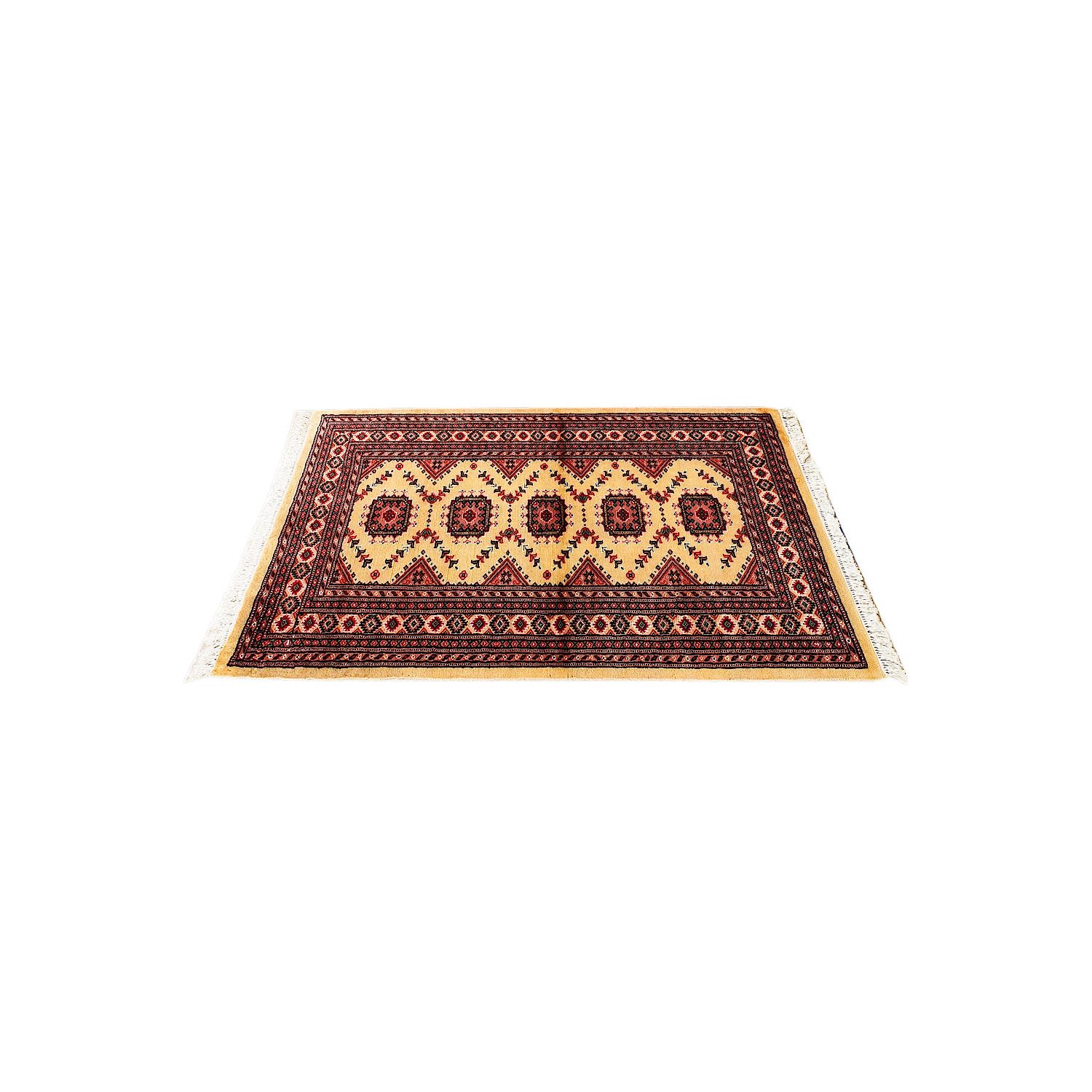 Such carpets arrive from Pakistan and are usually manufactured from wool and silk. They have traditional Sarouk and Yauo designs in a gul pattern that is repeated in series. They have a beautiful sheen and a smooth and soft feeling. Normally they are manufactured in a variety of colour combinations; a red - brown background colour along with a white, red, black and blue color motifs.