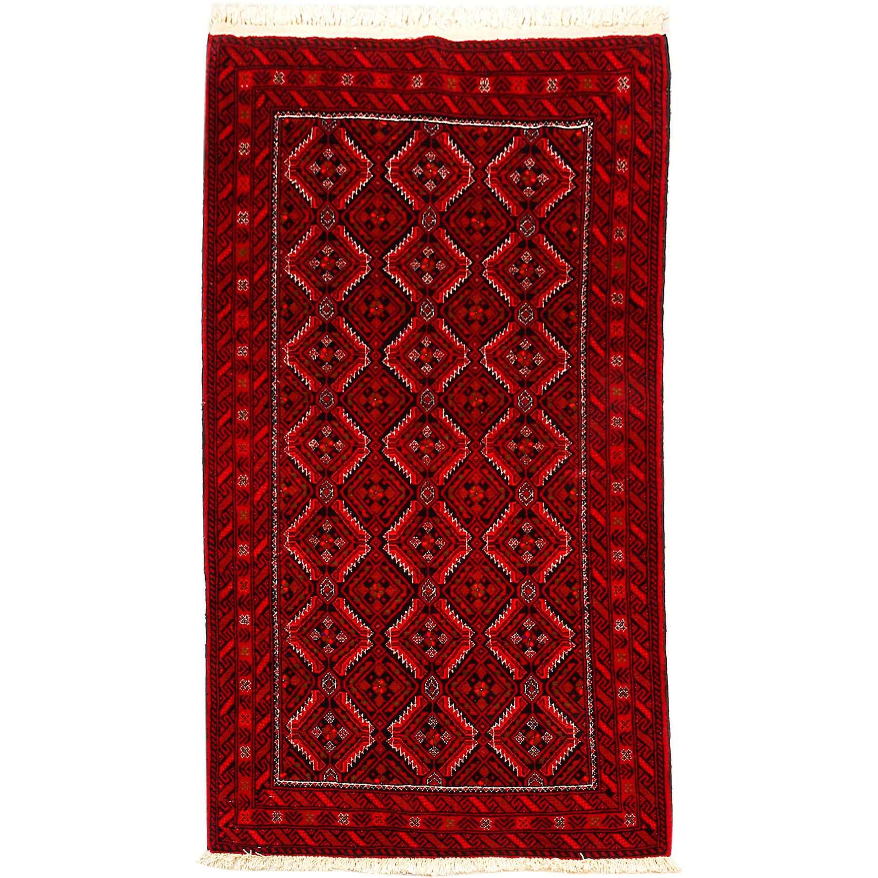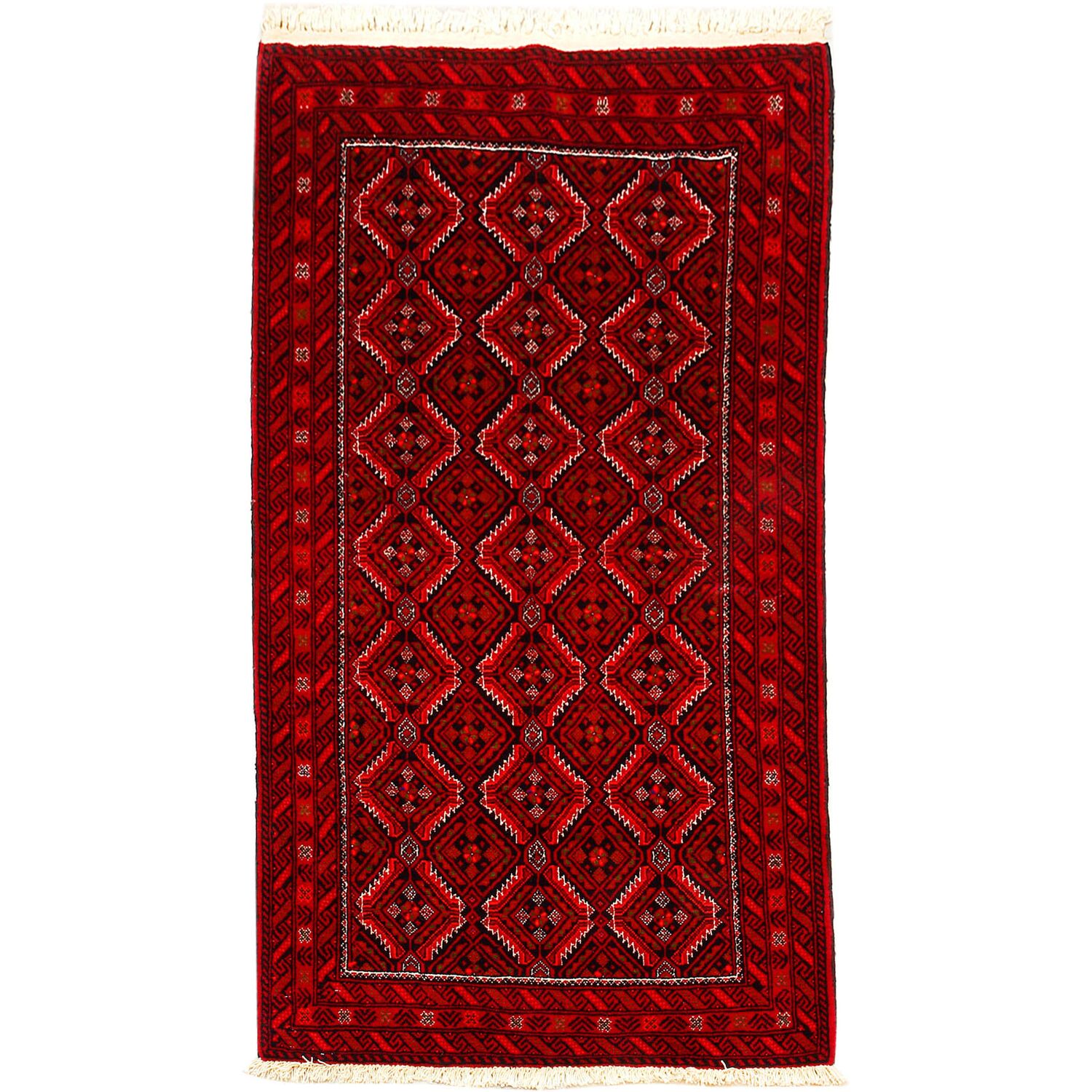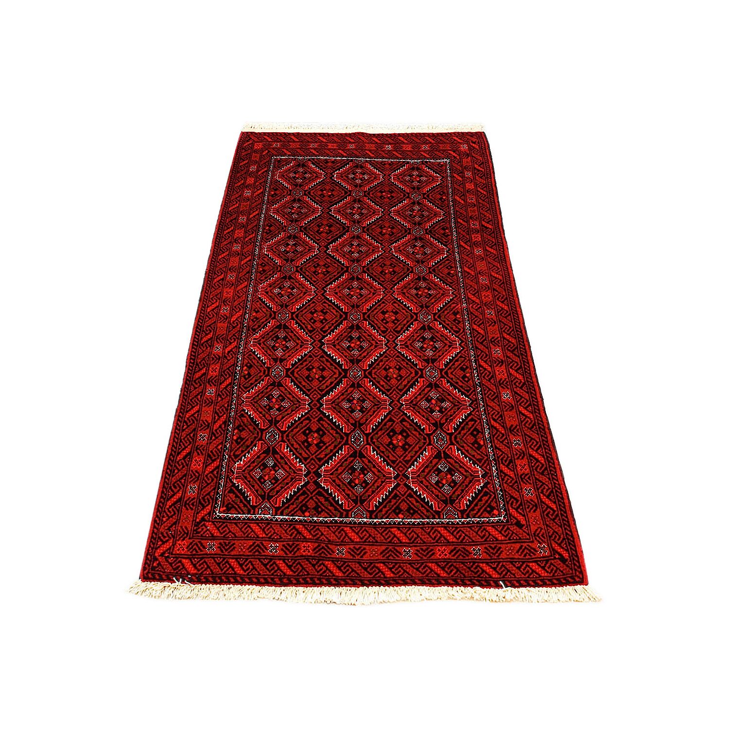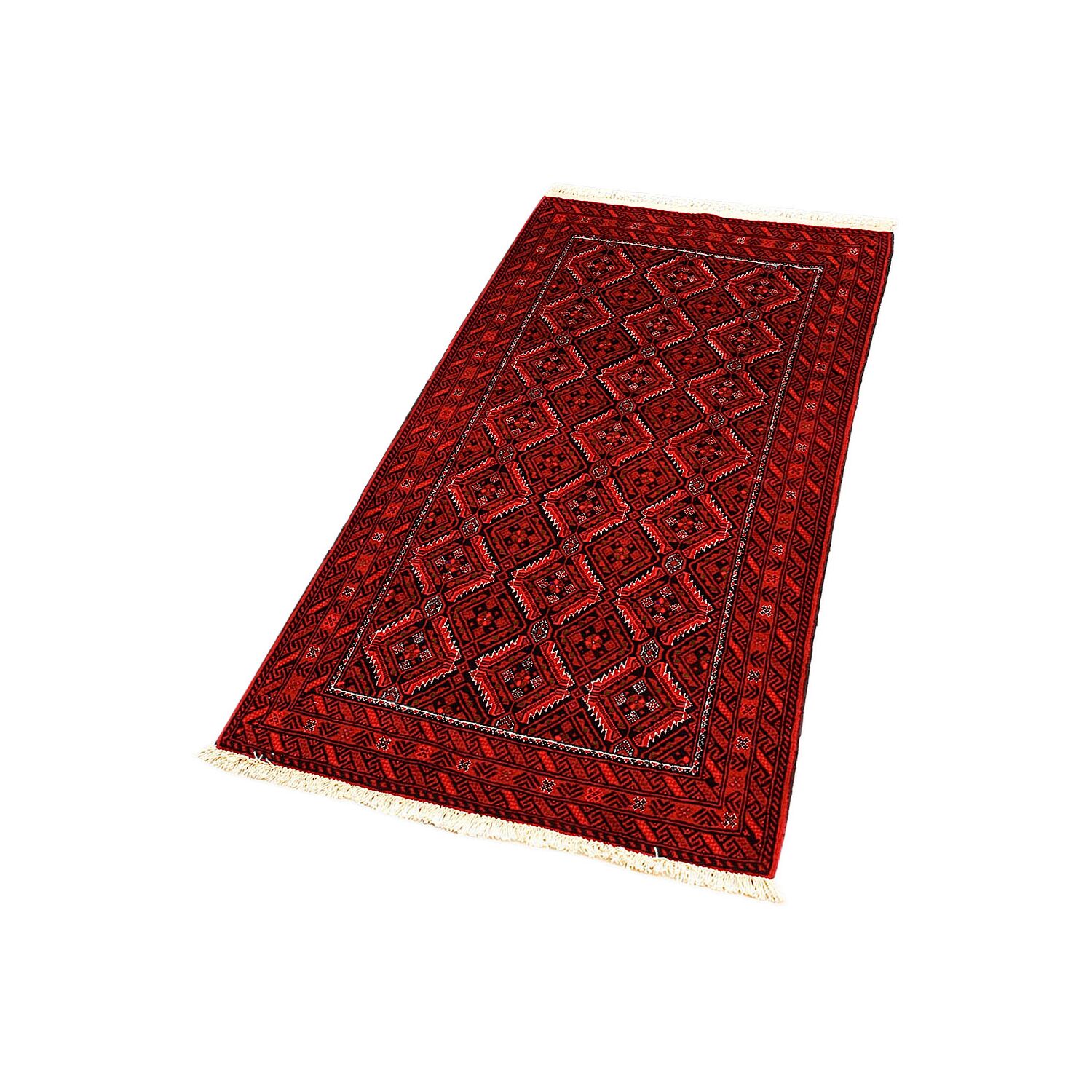 Baluch (or Baluchistan) is a region that includes the Baluchistan province in Pakistan as well as parts of Iran and Afghanistan. These very durable carpets are called Baluchi / Beluchi / Balochi since they are made in this border region; they are usually made of 100% wool and in small sizes, and feature dark red and brown colours and repetitive forms, usually the "gkiua" pattern.